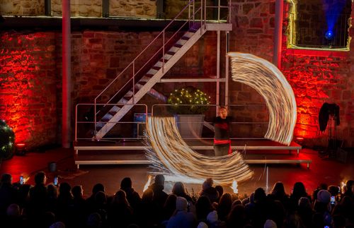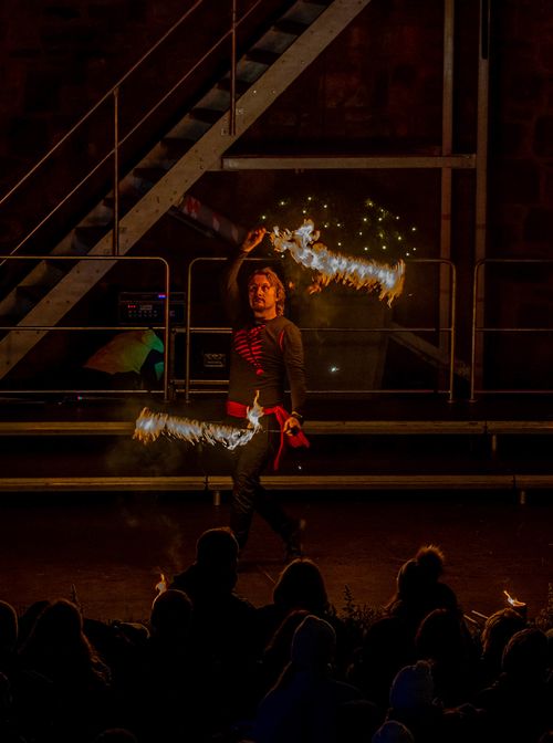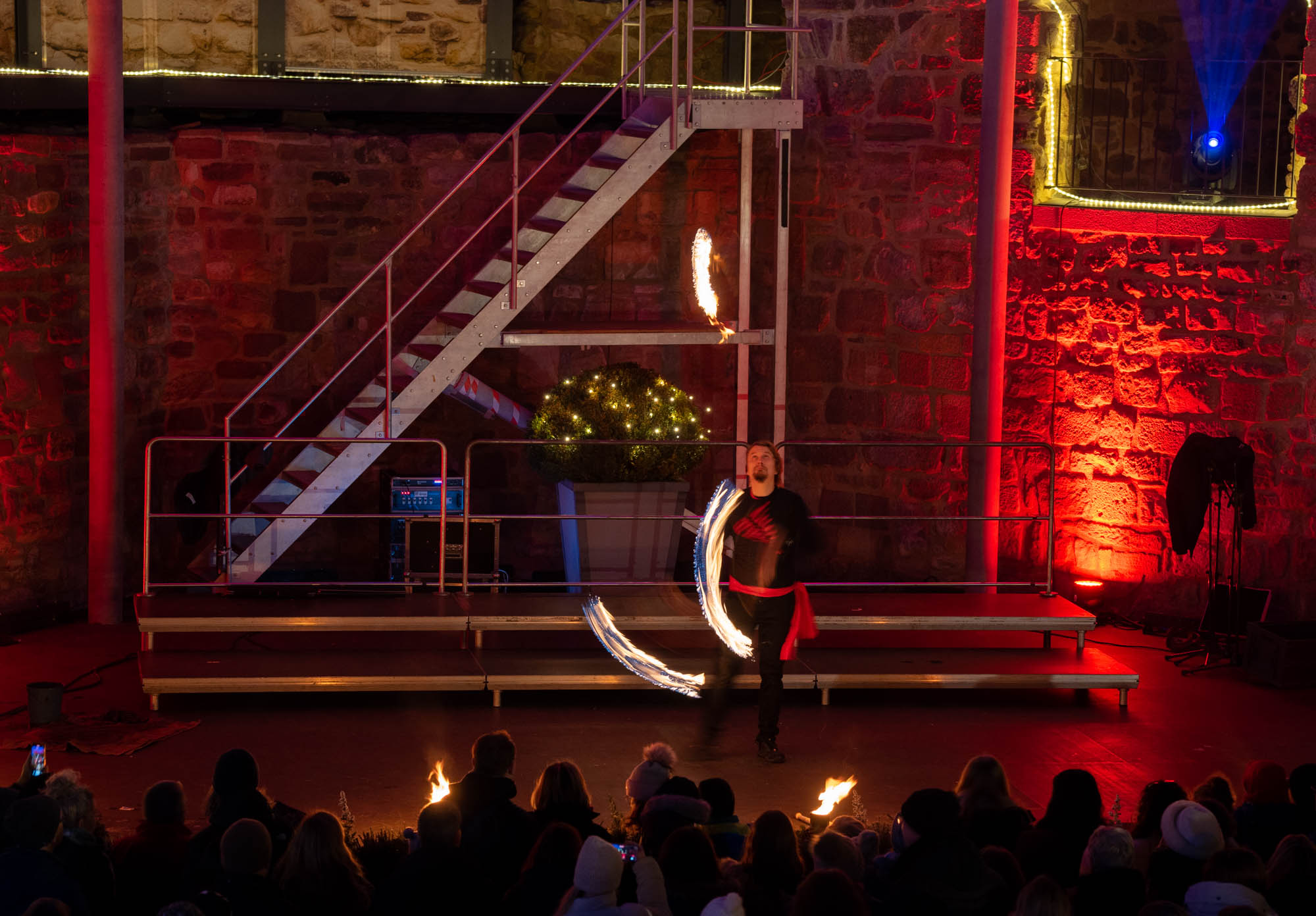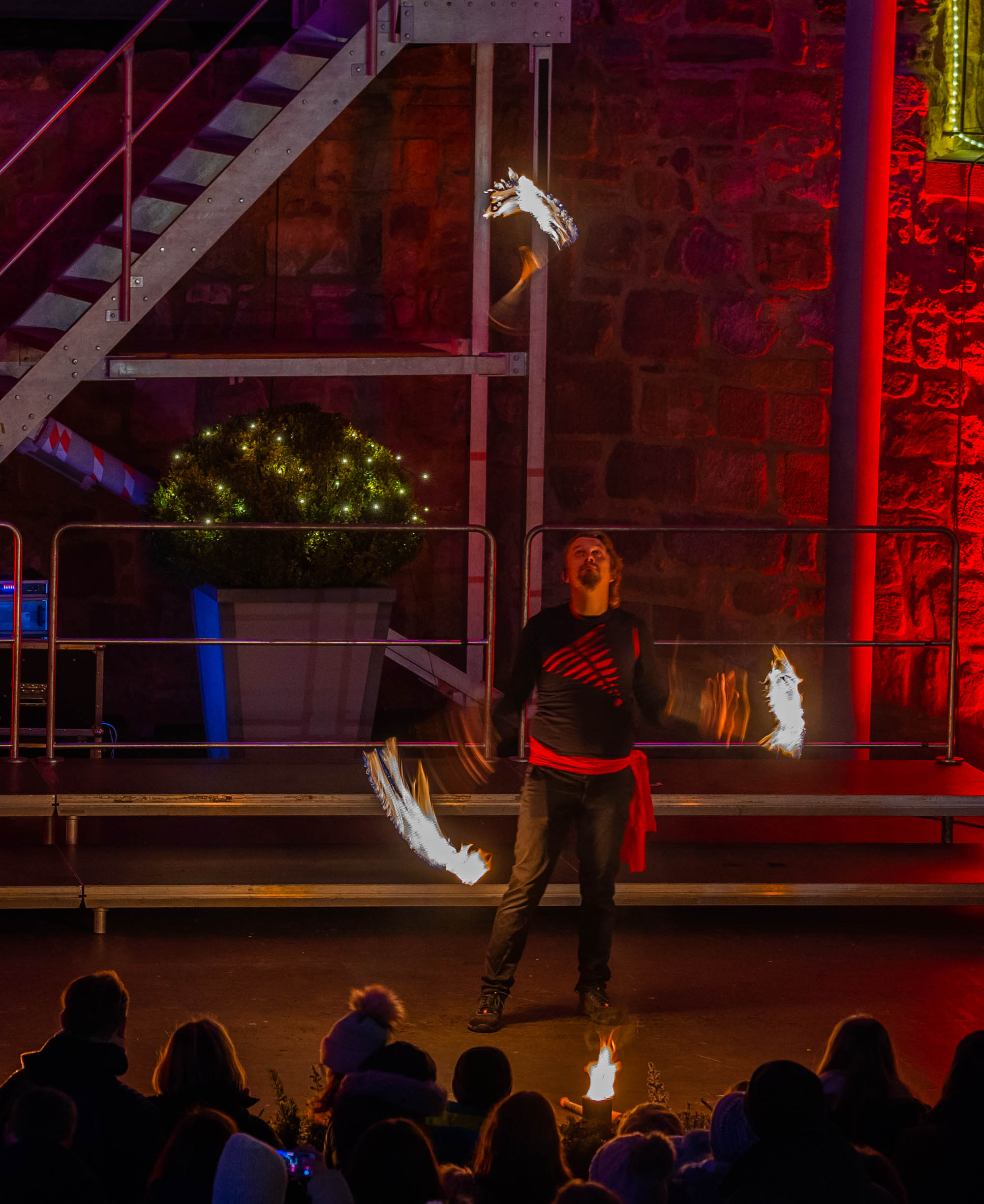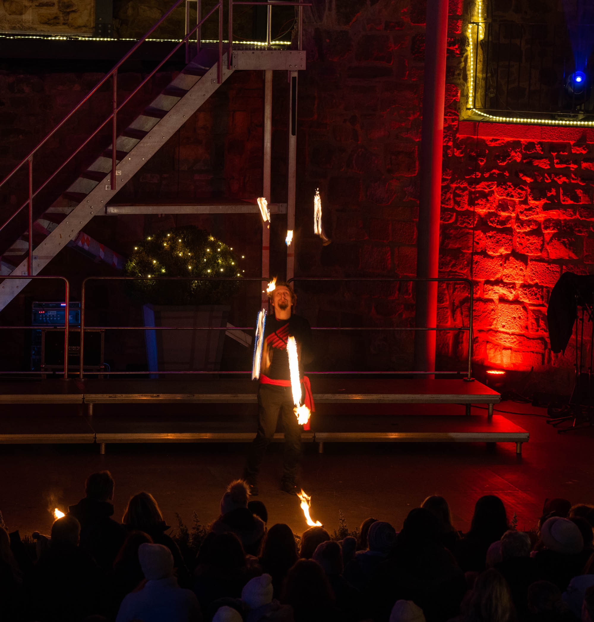 Ich hatte die Freude, den Weihnachtsmarkt in Bad Vilbel auf der historischen Wasserburg mit meiner Classic Fire Show zu bereichern. Auf der Bühne entstand ein Spiel aus Licht, Flammen und Bewegung. Funken sprühten in die Nacht, während die Jonglage mit brennenden Fackeln die Zuschauer in Staunen versetzte. Die Kombination aus klassischer Feuershow und perfekt abgestimmten Flammeneffekten schuf eine festliche, emotionale Atmosphäre.